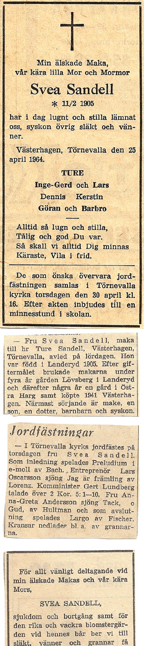 | Sandell, Svea, Västerhagen, Hallstra | 1935 | 1964-04-25 | |