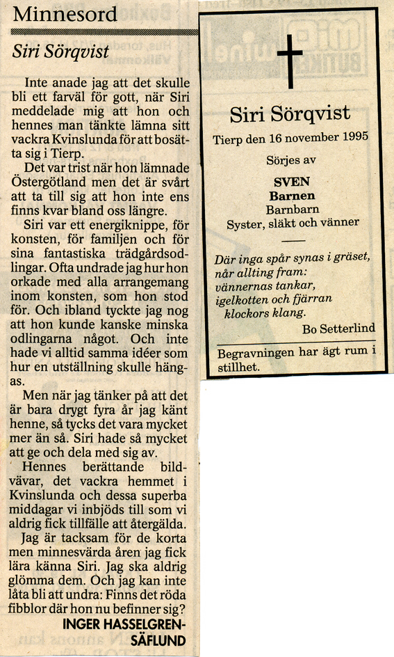 | Sörqvist, Siri, konstnärinna, Himmelslund, Bjärby | 1995-11-16 | ||