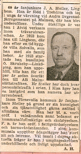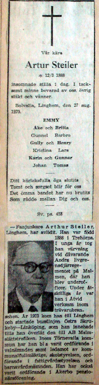 | Steiler, Artur, Linghem. Han byggde vid Linghem bodde väl oppe i Himna innan. Närmast gamla Grips affär har du Tellbo, sen Steilers det heter Solvalla, Wilhelmssons och så Evert Anderssons. Sen kommer Bäckliden. Steiler hade buss, startade en busslinje, och en personbil så han lärde folk ta körkort. Karin Järnholt är Steilers dotter. | 60 år 1948 | 1970-08-27 | |