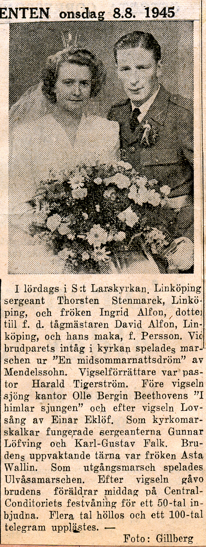 | Stenmark, Thorsten, sergant, med maka Ingrid Alfon dotter till tågmästaren David Alfon, Linköping. Alfon var bekant till Gustaf Wall d.y. | 1945 | ||