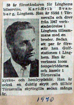 | Svanberg, Karl-Erik, montör, Svanberg med maka Britta Jonsson dotter till Algot Jonsson Togetorp, Östra Harg. Linghems Bilservice, macken i Linghem | 1940-talet | 50 år 1970 | |