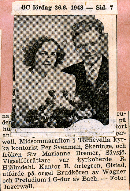 | Svenman, Per, Skeninge med hustru Siv Marianne Bremer, Sävsjö. Per eventuellt son eller brorson till mejerist Knut Svenman Skeninge, ("Svenman hade väl bara Britta och Åke, sen var det en till, Sven, men han dog mycket ung") | 1948 | ||