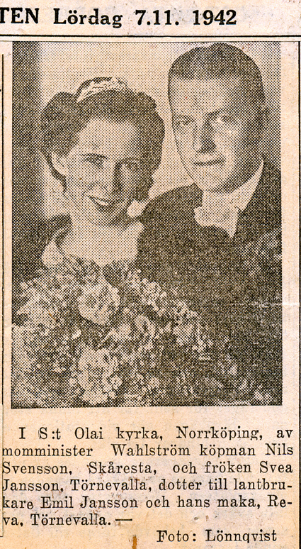 | Svensson, Nils, köpman, Skåresta med hustru Svea Jansson, dotter till Emil Jansson, Reva. Det var Reva Västergård där Brånby kom sen. | 1942 | ||
