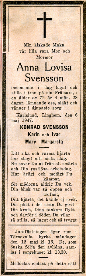 | Svensson, Anna Lovisa, Karlslund, det lilla huset vid Åkerbogården | 1947-05-06 | ||