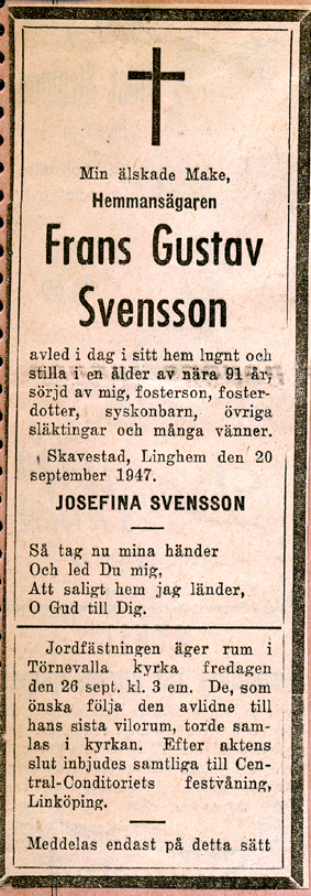 | Svensson, Frans Gustav, Skavestad | 1947-09-20 | ||
