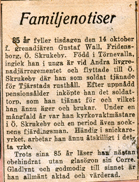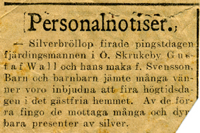 | Wall, Gustav, född i Skäggestad, far till Gustav Wall (f.1881) i Falkenborg, Linghem | Silverbröllop | 85 år 1941 | 1944-12-14 |