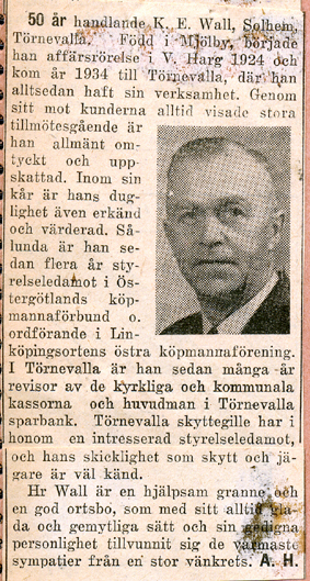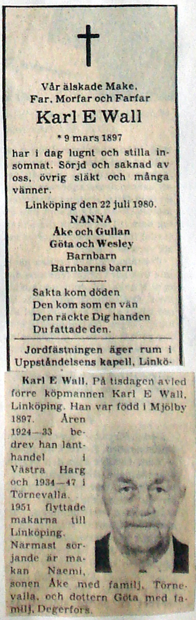 | Wall, Karl E., affärsman, K. E. Walls affär i Törnevalla | 50 år 1947 | 1980-07-22 | |