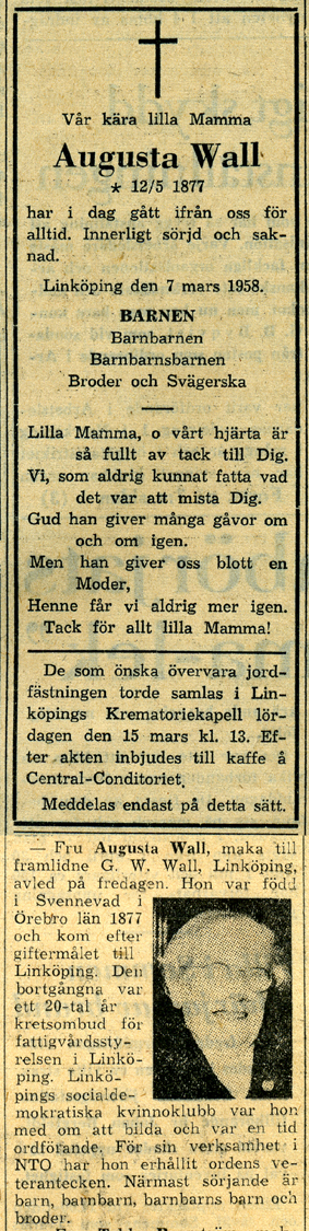 | Wall, Augusta, änka efter G.W. Wall, föräldrar till Karl E Walls affär. | 1958-03-07 | ||
