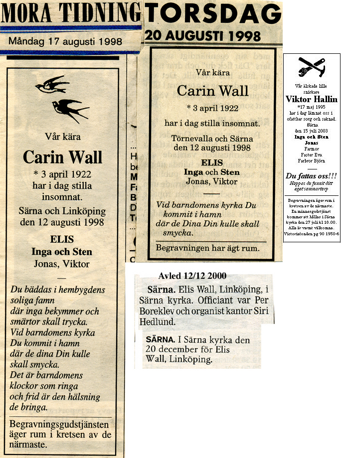 | Wall, Carin f. Tjern, Stenvallen, Bjärby gift med Elis Wall | 1953 | 60 år 1982 | 1998-08-12 |