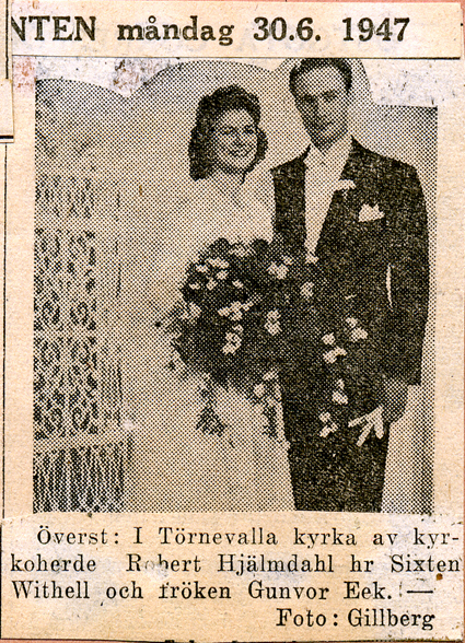 | Withell, Sixten med maka Gunvor Ek. Gunvor är kusin till Stig Smé. Gunvors mor hette Anna. Birgit Ek g. Bornhed är en syster | 1947 | ||
