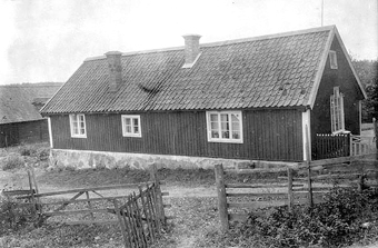 Den första folkskolan som senare blev lärarbostad. Läraren Reinhold Bergström med familj poserar på trappan.