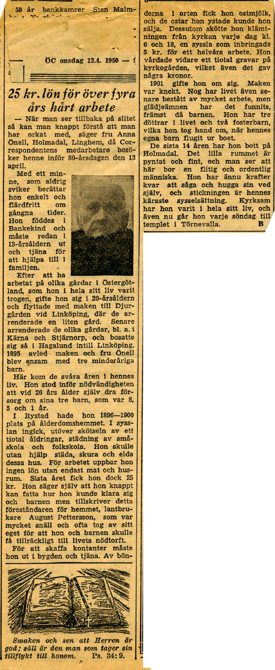 | 1950-04-12 | Corren | Anna Önell i Holmedal inför 80-årsdagen |