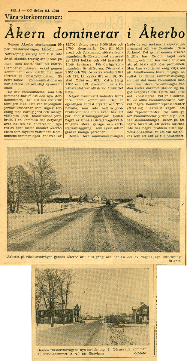 | 1952-02-08 | Corren | Åkrar och vägar i det nya Stor-Åkerbo. |