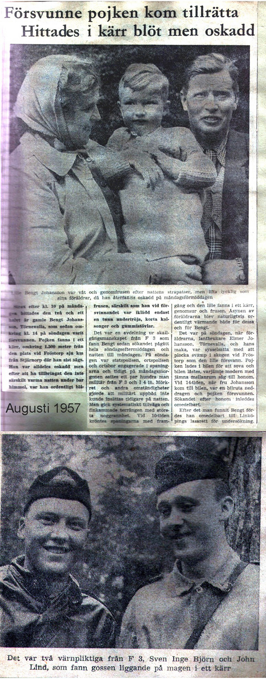 | 1957 augusti | Corren | Försvunnen pojke återfunnen |