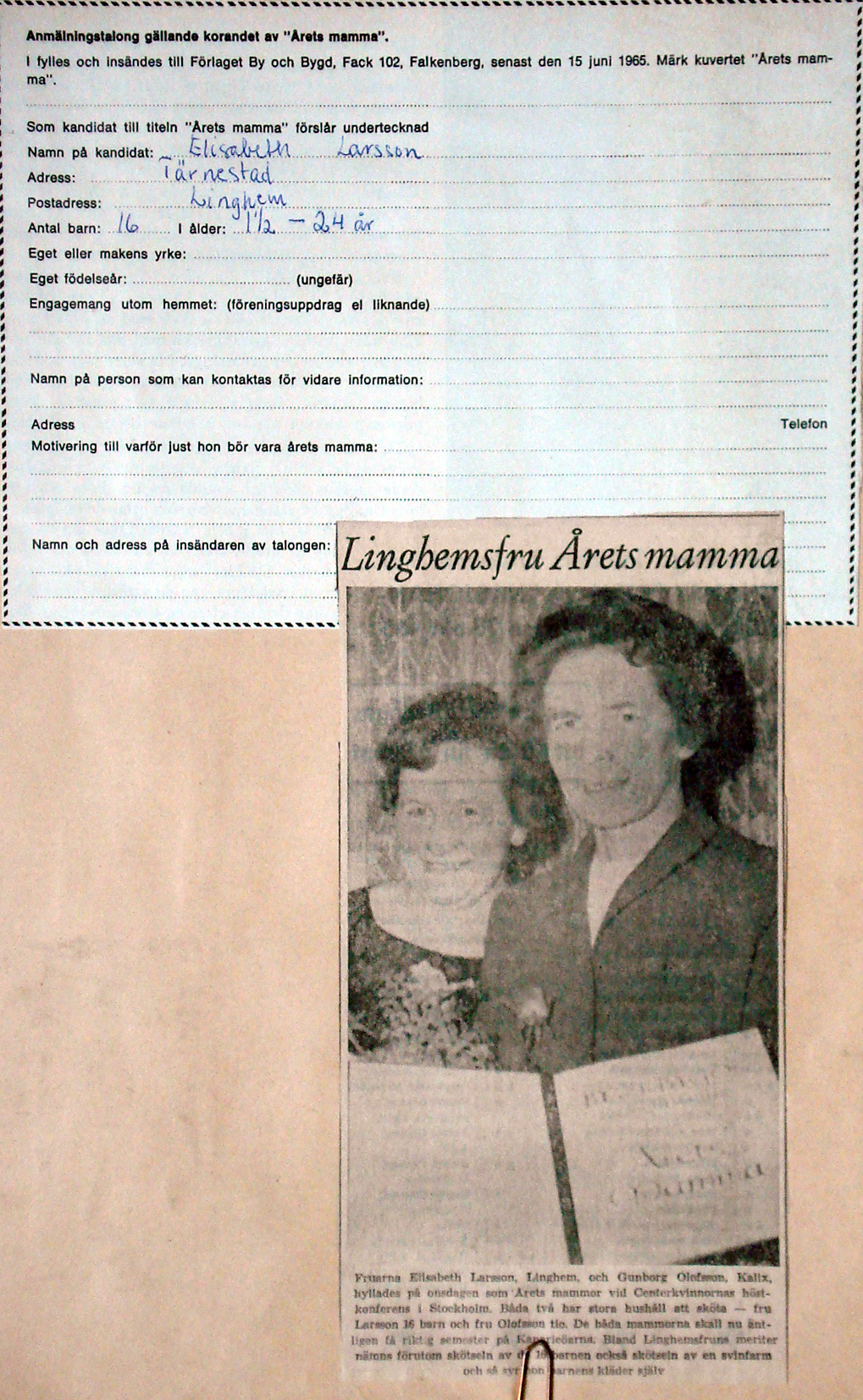 | 1965 höst | Corren | Lisa Larsson prisad som "Årets mamma" |