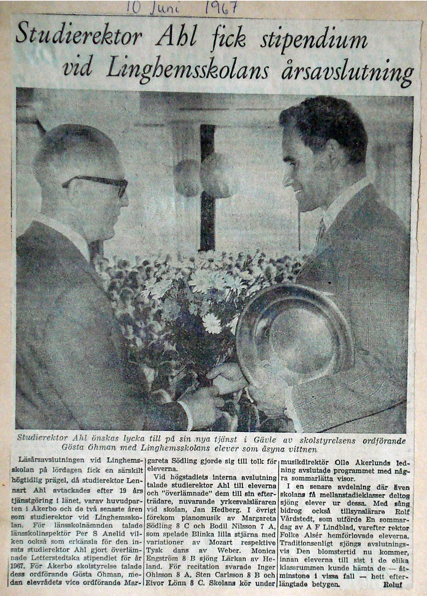 | 1967-06-10 | Corren | Studierektor Lennart Ahl avtackas med stipendium |