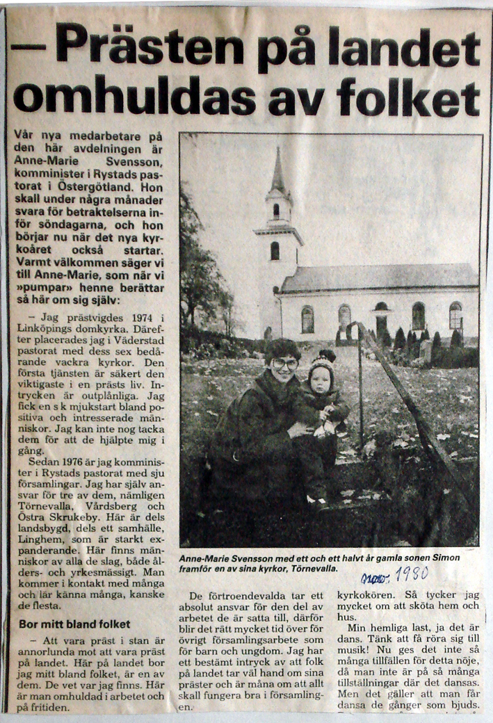 | 1980 november | Corren | Komminister Anne-Marie Svensson |