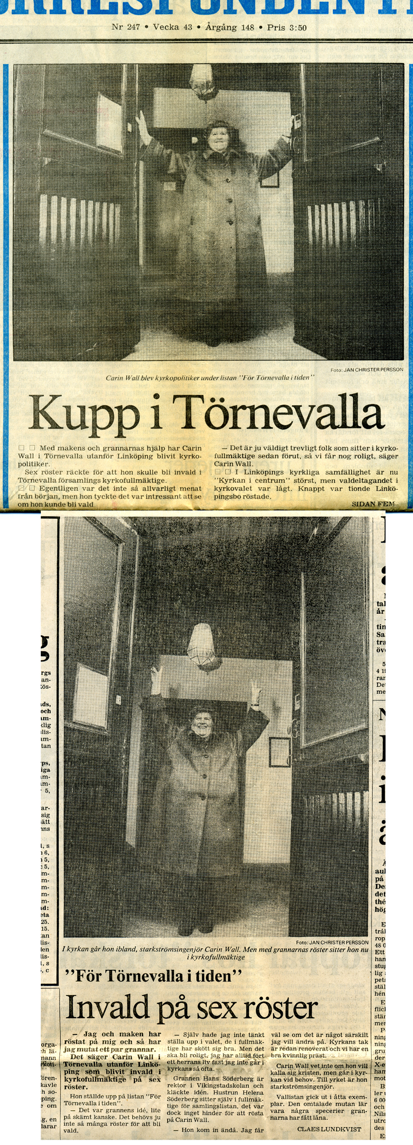 | 1985-10-23 | Corren | Carin Wall till kyrkofullmäktige på 6 röster |